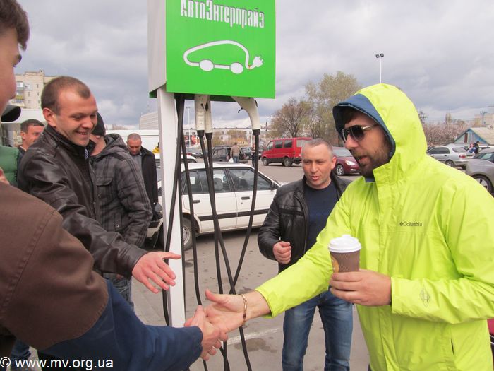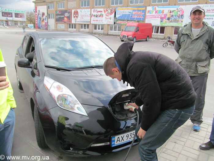 Встреча прошла возле супермаркета «Сильпо» (бывший «Амстор») на ул. Интеркультурной. Место выбрано не случайно. Это единственная точка в городе где можно зарядить электромобиль.
