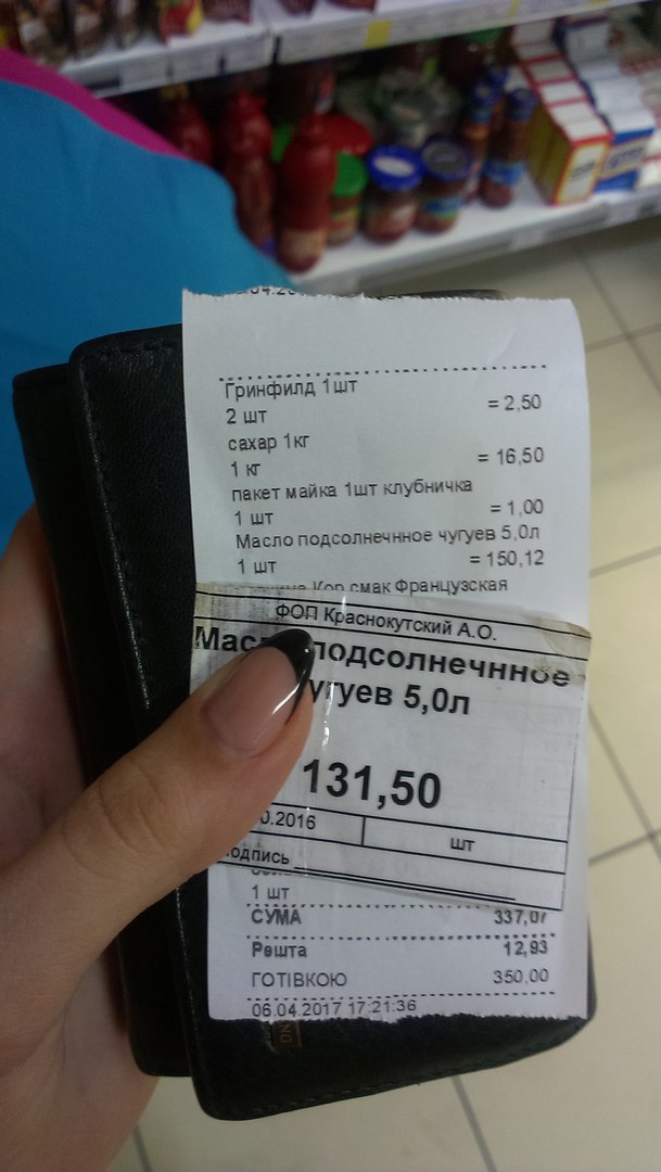 В одном из магазинов девушка приобрела 5-литровую бутыль подсолнечного масла, как она думала, за 131 гривну. В чеке же стояла совсем другая цифра - 150 гривен 12 копеек. В подтверждение своих слов, девушка сфотографировала чек и ценник на товаре и опубликовала фото в соцсети.