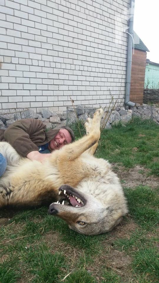 Сергей Рябчук спас волка два года назад. Тогда ему сообщили, что в Томаковском районе браконьеры убили волчицу. В логове оказались ее детеныши — два мальчика и две девочки. Сергей забрал себе одного из них, чтобы малыш не погиб без матери. Мужчине удалось выходить волчонка, которого назвали Якут. Сейчас он стал взрослым самцом и живет со своим хозяином в одном из частных домов Хортицкого района.