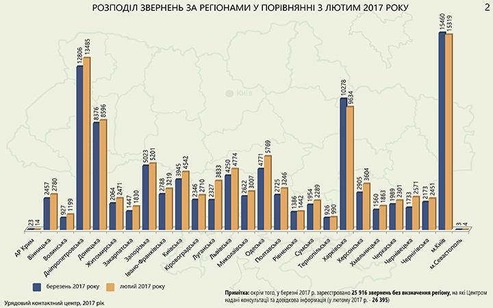 По данным Департамента информации и коммуникации с общественностью секритариата КМУ, чаще всего, в расчете на 10000 населения, в Правительственный контактный центр обращались жители г. Киева (28,5), Днепропетровской (22,4), Харьковской (18,0), Херсонской (16,4), Запорожской (15,3 ), Кировоградской (14,1) областей. Наименьшее количество звонков поступило от жителей Тернопольской (4,6) и Волынской (5,1) областей. Средний показатель обращений по Украине - 11,3 обращения.