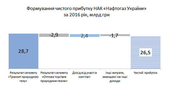 «По результатам 2016 года «Нафтогаз» получил чистый доход в размере 26,5 млрд грн, которое было обеспечено в основном прибылью от транзита», — сообщает «Нафтогаз».
