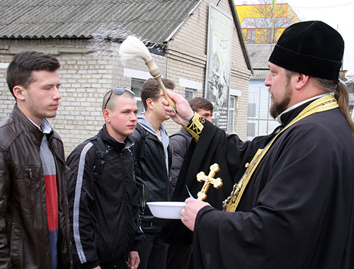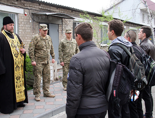 Ребята выстроились на плацу, слушают военкома, послушно целуют крест, подставленный благочинным церквей Мелитопольских о. Максимом.