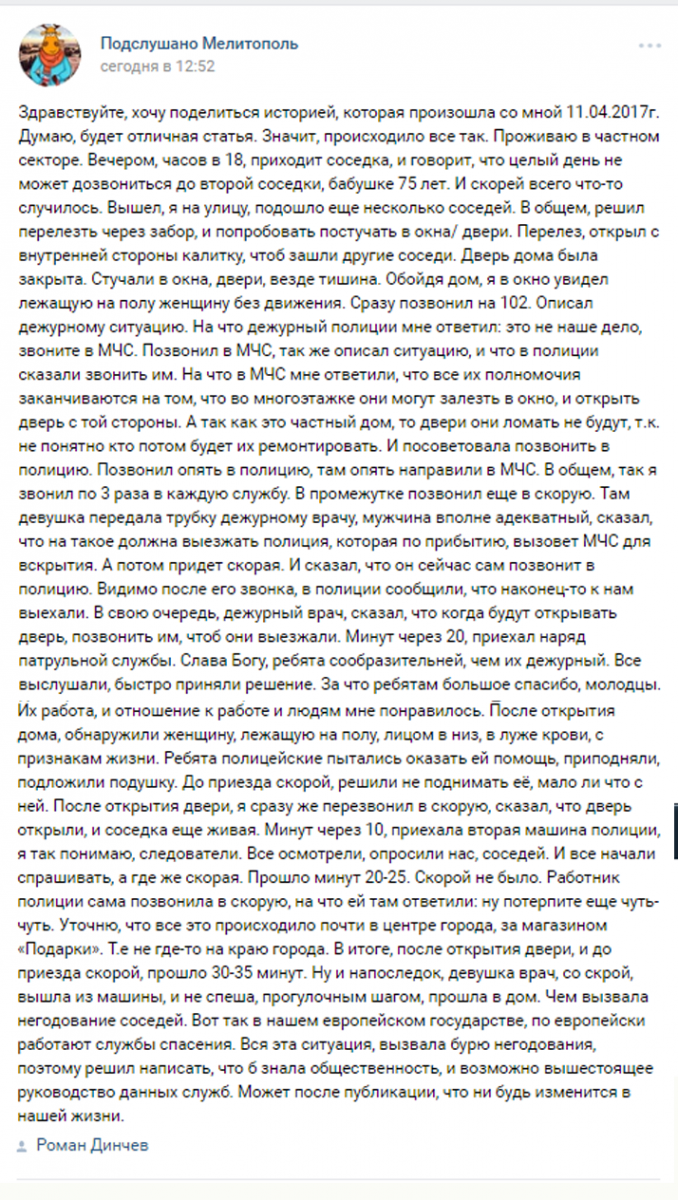 Предположив, что женщина нуждается в помощи, люди решили обратиться в экстренные службы. Однако, это оказалось непросто. Как утверждает непосредственный участник событий Роман Динчев, полиция и МЧС буквально "футболили" его, отсылая друг к другу. В итоге полицию вызвали работники Скорой. Свое общение с представителями служб экстренной помощи молодой человек описал в соцсети.
