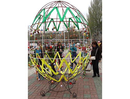 Перед входом в ДК им. Т. Шевченко на площади стоит большая "Писанка". Люди с удовольствием фотографируются на ее фоне, рассматривают маленькие писанки, вывешенные на ней.