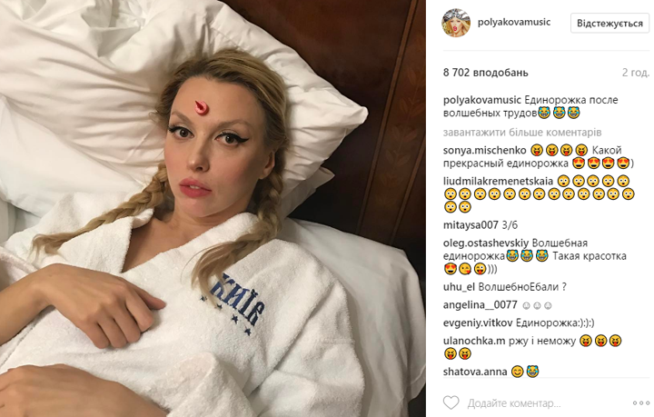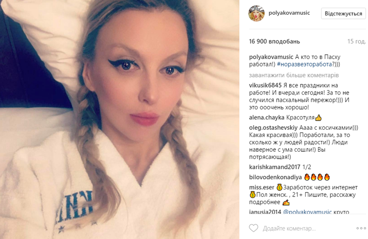 Фото сделано после концерта, когда артистка отправилась отдыхать в свой отельный номер. На фотографии Суперблондинка запечатлена в белом халате. На лице исполнительница – макияж с яркими стрелками, ее волосы собраны в две косички.