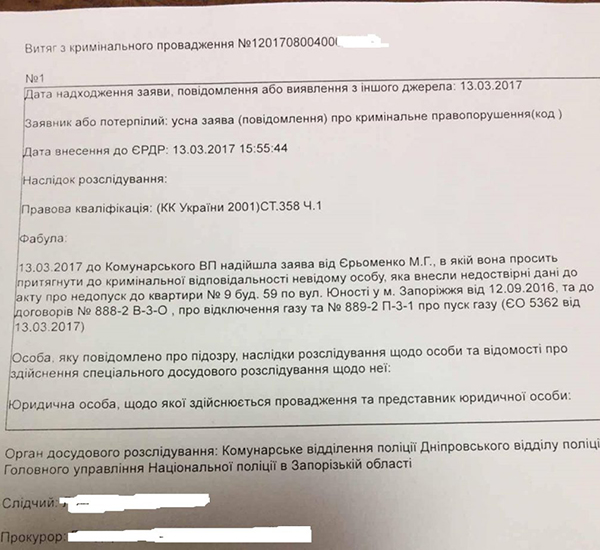 Так, в ходе судебного разбирательства было установлено, что должностные лица ПАТ “Запорожгаз” подделали документы, вовлекши в это мастера участка КП “Наше місто”. По данному факту возбуждено уголовное дело по ст. 358 УК “Подделка документов, печатей, штампов и бланков, их сбыт, использование поддельных документов”. Данное дело стоит лично на контроле руководителя местной Прокуратуры №2 Романа Мазурика.