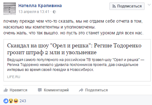 На заявление сразу же отреагировала продюсер передачи «Орел и решка» Нателла Крапивина.
