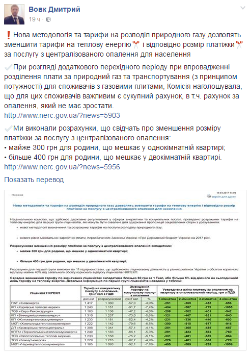 Об єтом заявил руководитель Национальной комиссии, осуществляющей государственное регулирование в сферах энергетики и коммунальных услуг, Дмитрий Вовк на своей странице в фейсбуке.