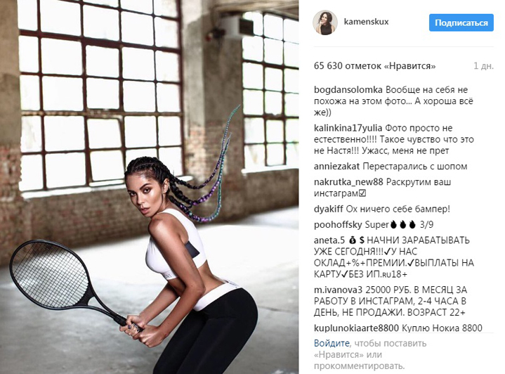 Певицу Настю Каменских, которая занята промо-кампанией своей коллекции спортивной одежды, раскритиковали за чрезмерное использование фотошопа. На одном из рекламных снимков, где Настя изображена с топе и леггинсах во время игры в теннис, она как две капли воды похожа на американскую звезду реалити-шоу Ким Кардашьян.