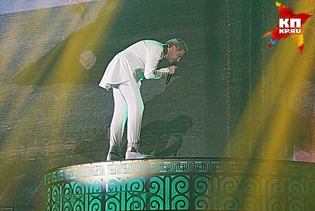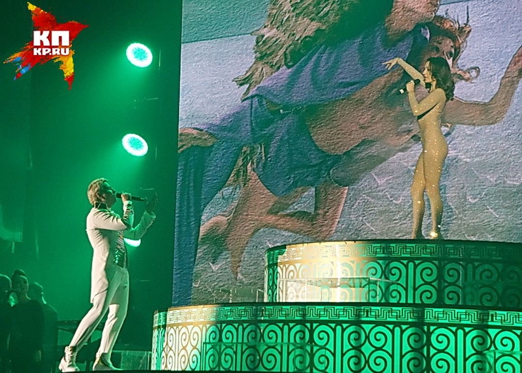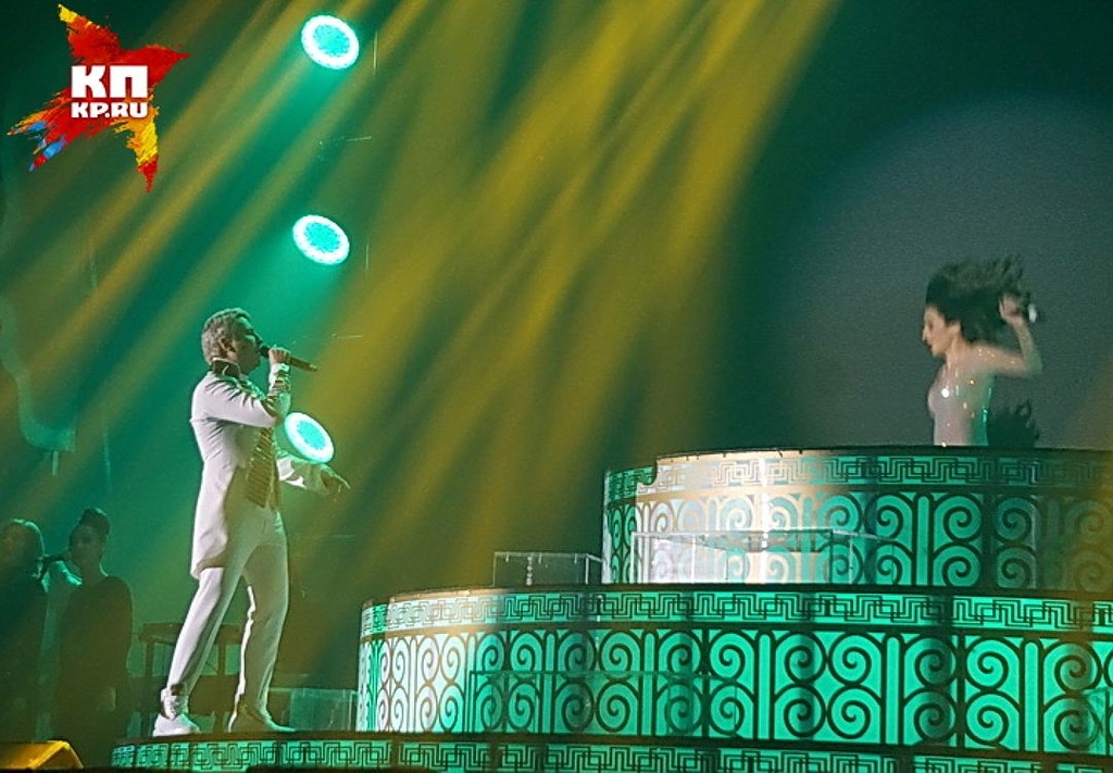 После этого она с Басковым еще раз начала исполнять совместную песню, но уже сидя на первой ступеньке подиума.