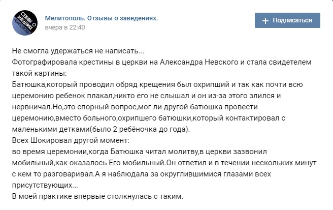 Батюшка прервал обряд и, по сообщению Ирины Шевченко, опубликовавшей этот отзыв в мелитопольском паблике, несколько минут разговаривал по телефону.