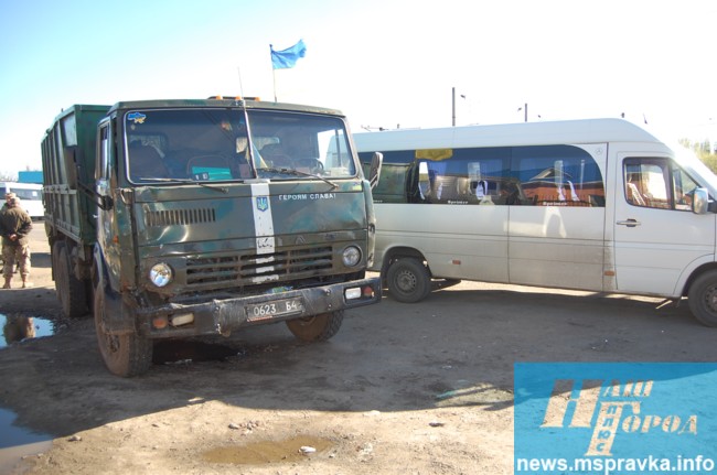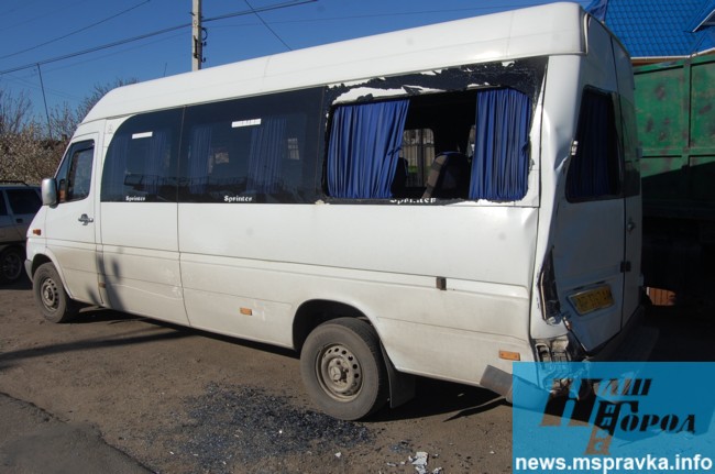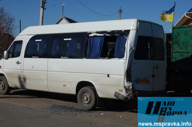Водитель микроавтобуса, по словам владельца авто, высадил пассажиров и стал разворачиваться, чтобы встать в очередь для ожидания. В этот момент в маршрутку въехал КАМАЗ с военными номерами и надписью “Героям слава!” на кабине.