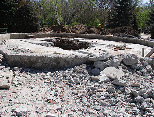 Также в парке продолжаются ремонтные работы фонтана и укладывается тротуарная плитка на Аллее Славы. В полуразрушенном состоянии осталась постройка около гимназии №10.