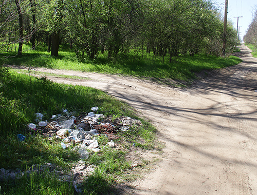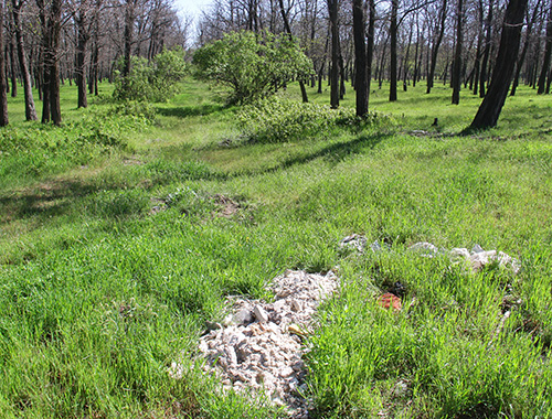 В одном из кварталов искусственного леса кто-то из жителей вывалил строительный муссор. Кстати, расстилая на мягкой травке свои коврики, следует быть осторожными - жители близлежащего частного сектора выпасают на этой самой мягкой травке своих коз и коров...