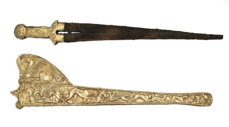 18 целых и три обломанных овальных пластинок, на которых выгравировано изображение лежащего льва, продолговатая пластинка, три золотые шишечки (варворки) и обломки различных золотых листочков, железный кинжал в серебряных ножнах, бронзовый колокольчик, серебряные круглые и продолговатые бусы (некоторые изготовлены из глины и обтянутые серебряным листом), костяные, железные и бронзовые наконечники стрел. В бронзовых - сохранились кусочки древесины, украшенные красными поперечными поясками.