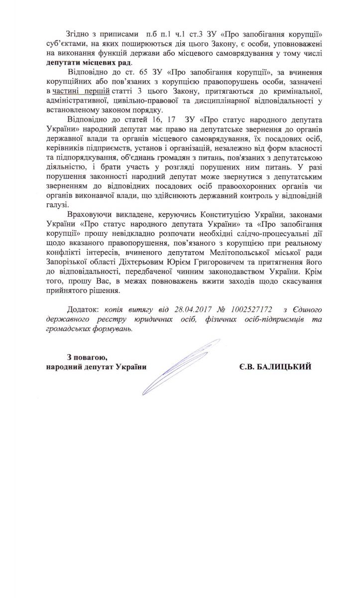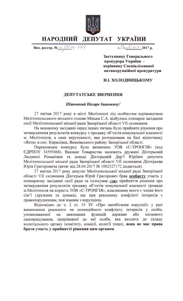 Что мелитопольский нардеп в антикоррупционную прокуратуру написал (ДОКУМЕНТ)