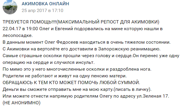 Во время взрыва снаряда, прогремевшего на прошлой неделе в Акимовке, пострадали двое молодых парней. Один из них получил тяжелые ранения и отправлен на лечение в Запорожье.