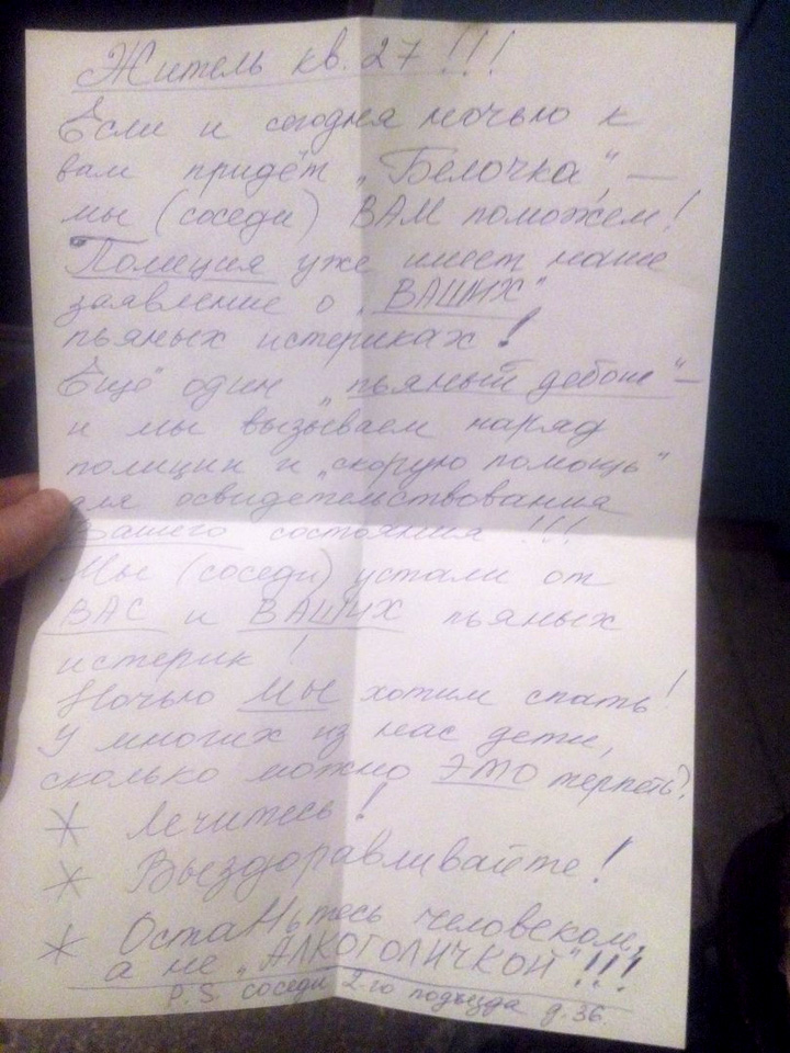 Женщина настолько утомила своих соседей пьяными истериками, что они обратились к ней с письмом, в котором предложили свою помощь.