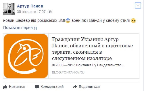 Соответствующую запись со ссылкой на “фейковую” новость Артур Панов розместил на на своей странице в Facebook.