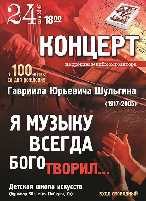 24 мая состоится концерт "Я музыку всегда боготворил", посвященный памяти члена Запорожского областного объединения композиторов, Почетного гражданина Мелитополя - Гавриила Шульгина, приуроченный к 100-летию со дня его рождения.