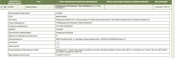 Согласно данным полученным из реестра общественных организаций, «Полк Победы» зарегистрирован меньше месяца назад – 13 апреля по адресу Сталеваров 17.