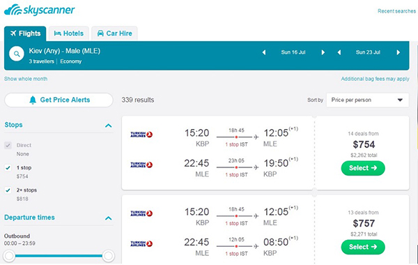 Самый дешевый перелет на Мальдивы для 2 взрослых с ребенком, по данным сайта skyscanner.net, - это еще 2260 долларов США, если путешествовать эконом-классом.