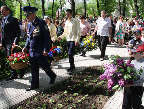 В парке собрались ветераны, вдовы, дети войны, а также представители городской власти и ученики близлежащих школ. Всех присутствующих и, в первую очередь, ветеранов, которые воевали за светлое будущее, поздравили городской голова Сергей Минько, глава городского общества ветеранов войны и труда Евгений Бабенко и глава узлового общества ветеранов Александра Башко.