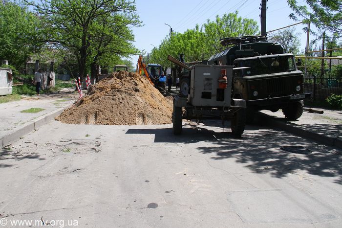 Укладывают и стальную, и пластиковую трубы, ведь на этом же участке проходит теплотрасса и газопровод, поэтому работать надо с осторожностью.