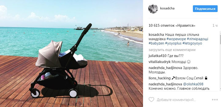 "Наше первое общее путешествие", - подписала снимок Осадчая, на котором изображена детская коляска со спящим малышом на фоне моря.