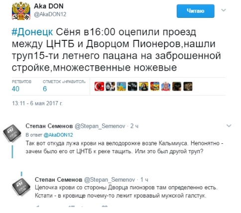 Сообщается, что мальчик после расправы по всей видимости пытался вылезти на людное место, чтобы попросить о помощи. Об этом говорит кровавая дорожка, которая была оставлена по тому пути, где полз изрезанный житель оккупированного Донецка. Однако когда парень все-таки дополз до места, где собираются местные скейтбордисты, то там было безлюдно. Труп юноши в луже крови и обнаружили прохожие.