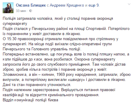 В Киеве посетитель супермаркета из огнестрельного оружия ранил охранника в живот.