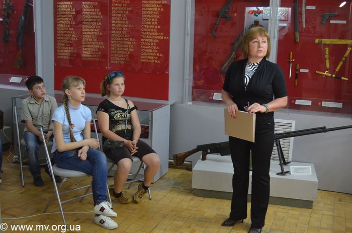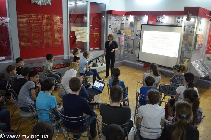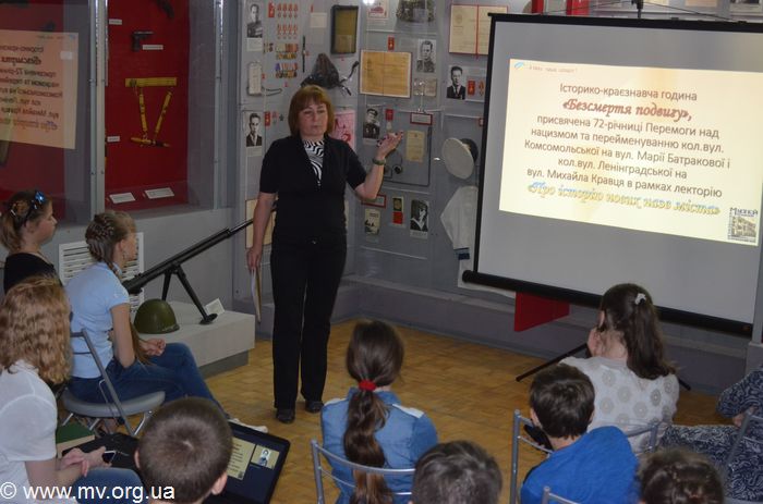 Научный сотрудник музея Светлана Мирошниченко детально, с фотоиллюстрациями и видеоматериалами, рассказала ребятам о двух Героях Советского Союза - Марии Батраковой и Михаиле Кравце, которые защищали нашу землю от немецко-фашистских захватчиков. Старший лейтенант М. Кравец за мужество, проявленное в бою за город Фастов (Киевская обл.), был удостоен звания Героя, а гвардии младший лейтенант М. Батракова участвовала в Мелитопольской наступательной операции, которая была успешно проведена с 26 сентября 1943 года. За мужество и героизм, проявленные в боях по освобождению Мелитополя, Указом Президиума Верховного совета она была награждена орденом Ленина и медалью "Золотая звезда". 19 марта 1944 года уже в госпитале она получила известие о присвоении высокого звания.