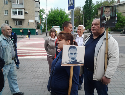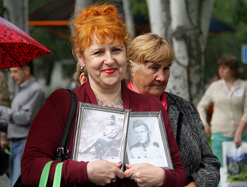 У многих портреты погибших солдат Второй Мировой, у некоторых - "георгиевские" ленты. На вопрос, зачем провоцируете, ведь государство запретило использование этого символа, одна из женщин отметила, что нигде законом ношение такой ленты не запрещено. А присоединившиеся к ней сторонники ношения данного символа выдвинули новую версию происхождения ленты.