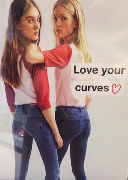 Торговая сеть Zara использовала в своей рекламе линейки джинсов со слоганом Love your curves ("Люби свои формы") моделей с формами крайне скромными. Это вызвало непонимание у потребителей.