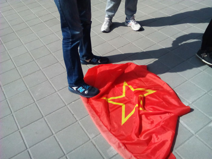 Бойцы «Скиф» вырывали из рук патриотов флаги, которые они отобрали у коммунистов, отталкивали и били их.