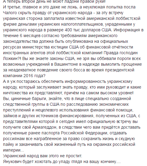 ...Это даже не ложь, а неуклюжая попытка посла Чалого скрыть правду от украинского народа - за эту встречу украинская сторона заплатила известной американской лоббистской фирме деньгами украинских налогоплательщиков, украденными у украинского народа в размере 400 тысяч долларов США. Информация в течение 6 месяцев согласно требованиям американского законодательства должна быть опубликована на официальных ресурсах министерства юстиции США об финансовой отчётности иностранных агентов этой лоббистской компании!", - в частности написал Андрей Артеменко.