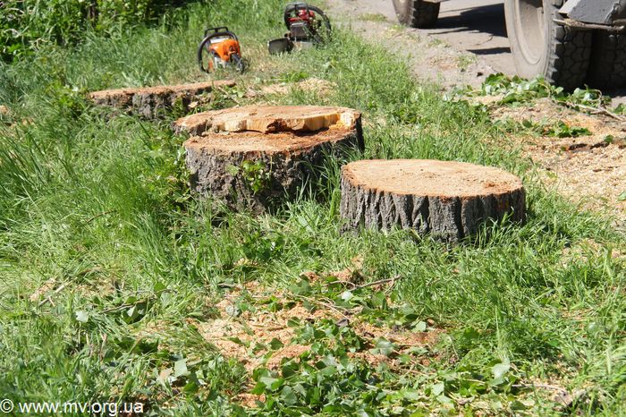 Эти деревья уже никуда не пригодные. Посадят свежие и все будет хорошо. А пни выкорчуют.
