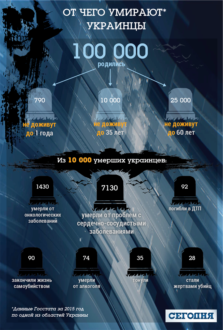 Для примера рассмотрим судьбу 100 000 новорожденных украинцев. По статистике, 790 человек умрут в возрасте до одного года. 10 000 украинцев не доживут до 35 лет, и 25 000 – до 60 лет. Из этих 100 000 восемь человек погубит туберкулез, двое умрут от последствий ВИЧ, 184 – от онкологических заболеваний, 16 человек погубит алкоголь, 12 разобьются в ДТП, пять человек утонут. Кроме того, 12 человек покончат жизнь самоубийством. Но самая распространенная причина смерти – болезни сердечно-сосудистой системы. На 100 000 украинцев приходится 918 смертей от проблем с кровообращением.