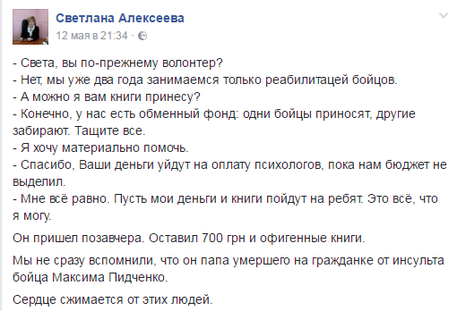 Председатель общественной организации "Побратим" Светлана Алексеева на своей странице в facebook описала трогательную историю.