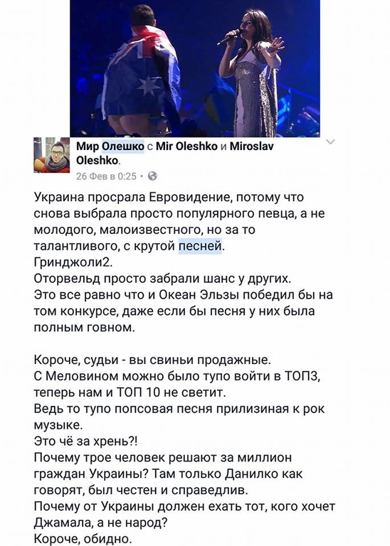 Украинский блогер Мирослав Олешко обвинил певицу Джамалу в том, что Украина заняла 24-тое место на "Евровидении-2017", так как она "продвинула" на выступление группу O.Torvald.
