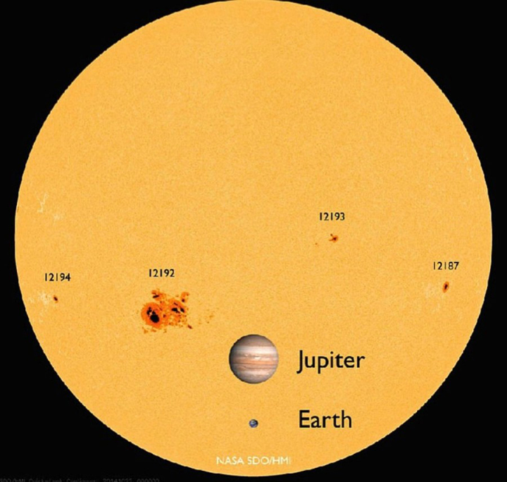 Вот так должно выглядеть «нормальное» Солнце — с пятнами. Изображения Земли и Юпитера добавлены на диск Солнца для сравнения.