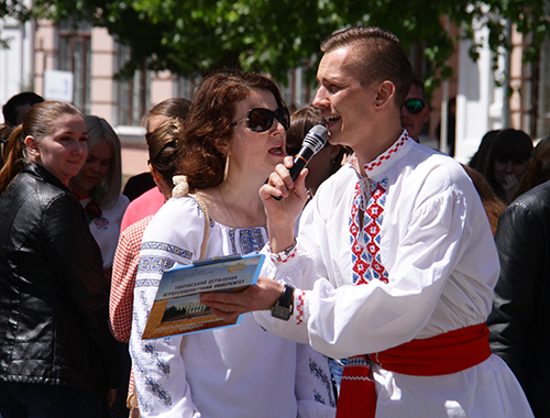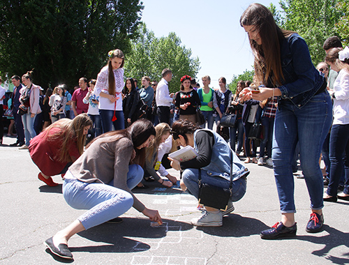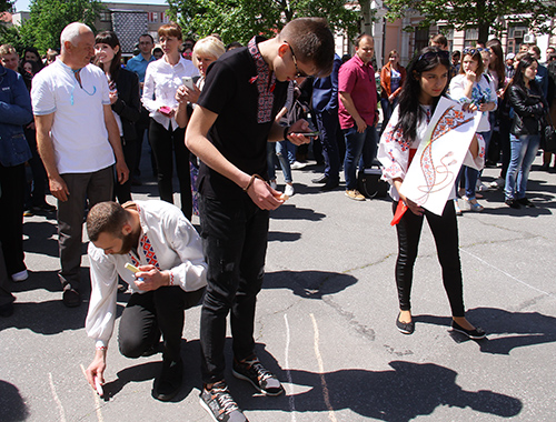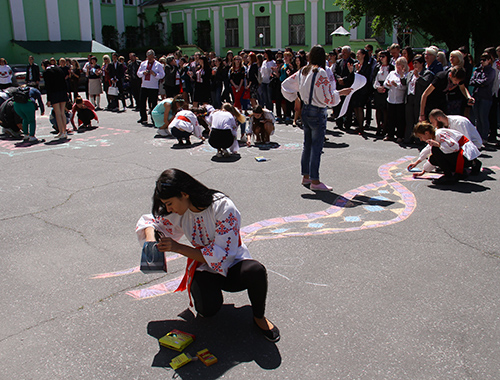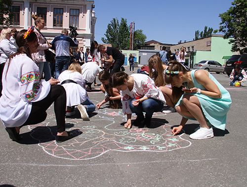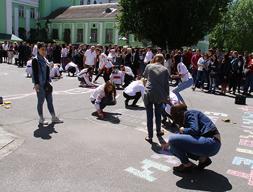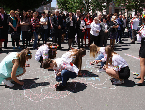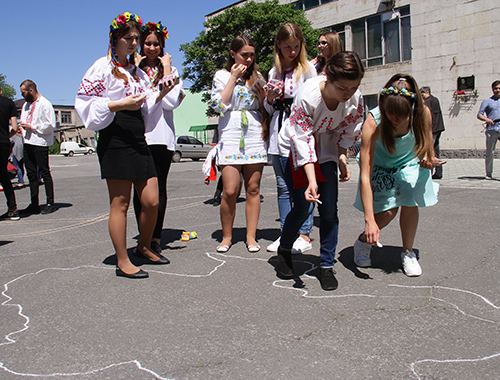 Здесь на большой перемене звучала веселая музыка, а команды всех факультетов рисовали мелом "Вышиванку - мой генетический код",