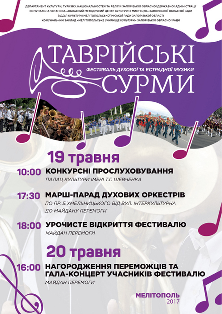 19-20 мая в Мелитополе состоится традиционный фестиваль духовой музыки "Таврiйськi сурми". Более 30 музыкальных коллективов из разных городов Украины порадуют горожан духовой музыкой.
