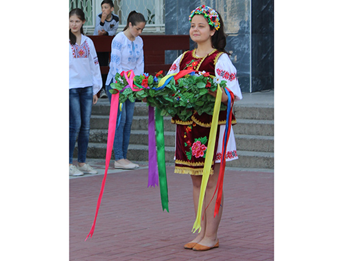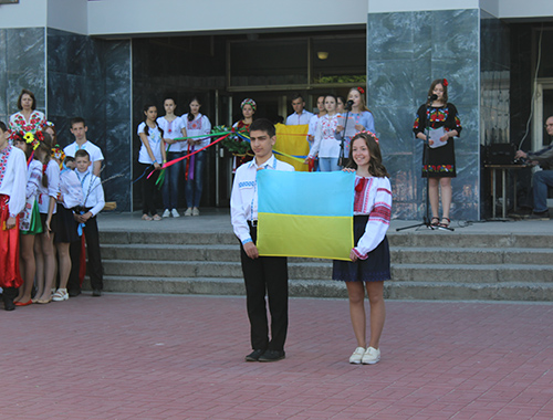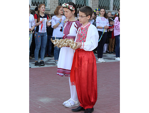 Во дворе школы, где собрались все ее учащиеся и педагоги, прошел парад основных украинских символов. Первыми перед зрителями предстали школьники, несущий наш герб, за ними – флаг. За ними вышли ученики, символизирующие наш язык. Также ученики вынесли булаву, рушник, коровай, оберег «дом», гончарные изделия, куклу-мотанку, пасхальные символы (кулич и крашенки). Помимо этого, на Украине достаточно символических растений, которые также были представлены учениками школы: тополь, верба, калина, чеснок, подсолнух и пшеница.