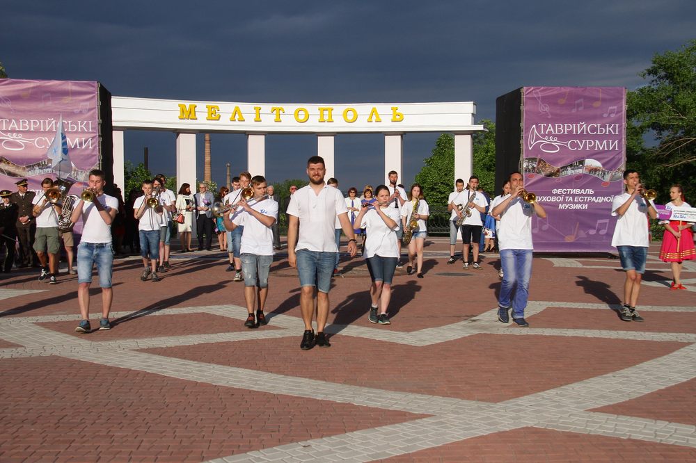 На площади Победы у арки музыкантов встречали организаторы фестиваля и сотни мелитопольцев, ведущие представили оркестры. Танцоры народного ансамбля танца "Червона калина" Мелитопольского училища культуры приветственным танцем открыли традиционный фестиваль духовой и эстрадной музыки "Таврiйськi сурми", который проводится в нашем городе уже в восьмой раз. Он был впервые проведен в 2003 году по инициативе Мелитопольского училища культуры. Сводный оркестр из участников фестиваля и сводный хор художественных коллективов Мелитополя, куда вошли хоровые капеллы МГПУ им. Б. Хмельницкого и "Таврия", народные ансамбли ветеранов "Фронтовичка" и немецкой песни "Эдельвейс", хоровой коллектив МУК "Свiтанок", ансамбль чешской песни "Богемия" и народный хор "Черешни" ЖДК, исполнили Гимн Украины, мощно прозвучавший над площадью. Дирижировал сводными хором и оркестром доцент Днепропетровской академии музыки Сергей Петросян.