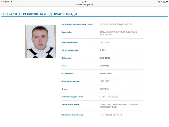 30-летний житель Днепра Александр Гладченко, который, по данным следствия, принимал непосредственное участие в избиении ветеранов АТО во время празднования Дня Победы над фашизмом во Второй мировой войне, скрылся в оккупированном Крыме.