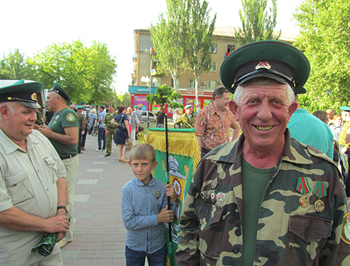 Дружное «УРА» было наградой выступающим. В колонне, кстати, были пограничники всех возрастов. С удовольствием примеряли зелёные фуражки и береты дети, гордящиеся своими отцами и дедами.