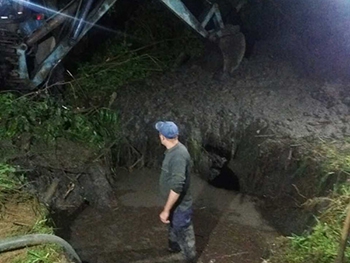 Прорвало трубу диаметром 500 мм. На место аварии сразу выехали аварийные бригады и спецтехника. Работы велись всю ночь и продолжаются до сих пор. Специалисты КП "Водоканал" выполняют демонтаж стальной вставки трубопровода длиной 5 м.