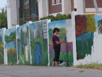 Разрисовка бетонных плит около дамбы практически завершена. На восемь плит уже нанесены рисунки и размечены стихи.