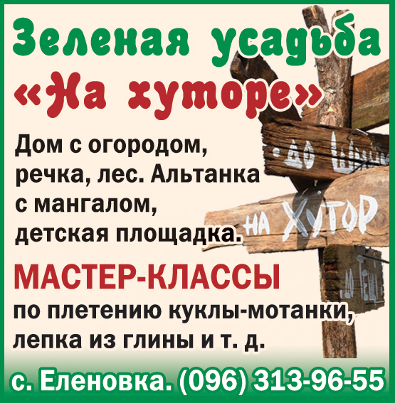 льский район также с удовольствием ждут гостей со всей Украины. Каждая усадьба старается чем-то особенным удивить своих гостей, предложить какую-то свою «фишку»: соляную комнату, целебный сон под жужжание пчел, дегустацию вин, колоритную фотосессию и пр. К примеру, в имении «На хуторе» (с. Еленовка) тихое утро вы можете начать с прекрасной рыбалки, ведь усадьба расположена возле реки, а днем - прогуляться по тенистому лесу, убегая от изнуряющей жары. Отдых в живописном месте на территории лесничества придется по душе буквально всем: пока взрослые готовят вкусный шашлык, дети резвятся на природе, заняты на мастер-классах по изготовлению кукол-мотанок, лепкой из глины, декупажем и др.Забыв обо всех проблемах, сняв домик с огородом на пару недель и взяв с собой детишек, здесь можно провести прекрасные каникулы и насладиться всеми прелестями сельского быта. При этом ни полоть, ни поливать вас никто не заставит - вы едете исключительно на отдых и клубнику со сливками.